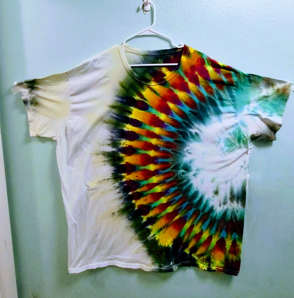 This shirt is remnicent of music and light, piercing through the darkness. In this collection, each shirt is slightly different, but they are all similar in design and coloration. Find your unique wearable art today!